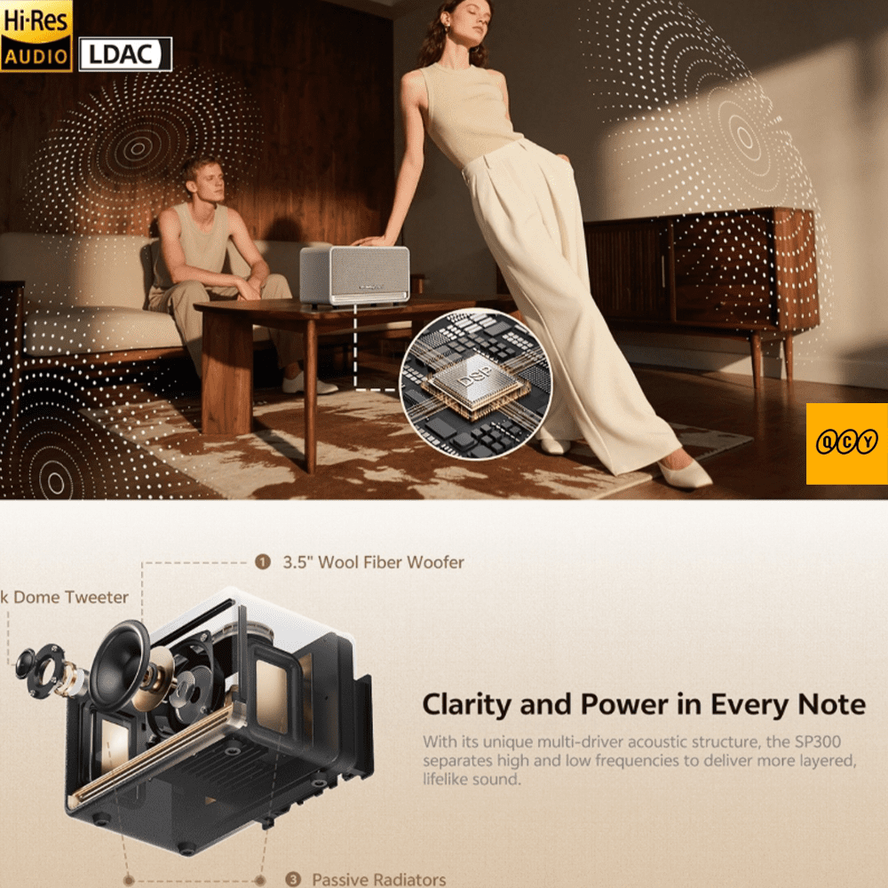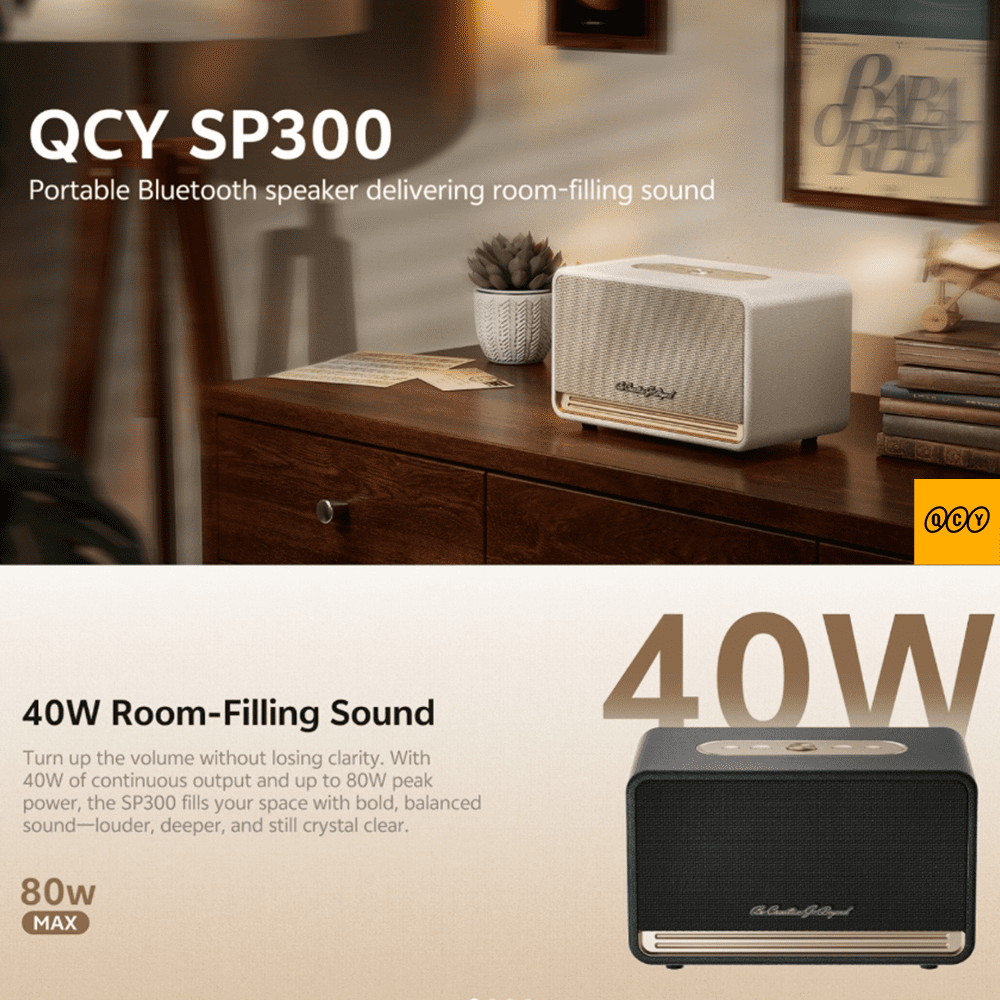 QCY SP300 je retro-dizajnirani kućni Bluetooth zvučnik s 80W peak snagom, LDAC lossless audio codecom i do 20 sati autonomije. Kućište od MDF drveta smanjuje rezonanciju i daje topao, bogat zvuk koji podseća na klasične hi-fi zvučnike – uz potpuno modernu bežičnu tehnologiju.