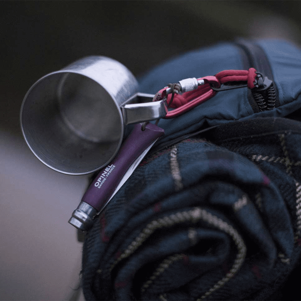 Drška u tonu granata (tamnocrvena) radi od otpornog polimera ili obojene bukve, što ga čini uočljivim u torbi ili rancu — praktično za terene gdje se noževi lako izgube. Deblji profil inox ostrice N°08 Bushwhacker posebno je otporan pri grubim outdoor zadacima kao što su krčenje granja, obrada drveta i priprema hrane u prirodi. Virobloc brava drži ostricu zaključanom tokom cijele upotrebe.